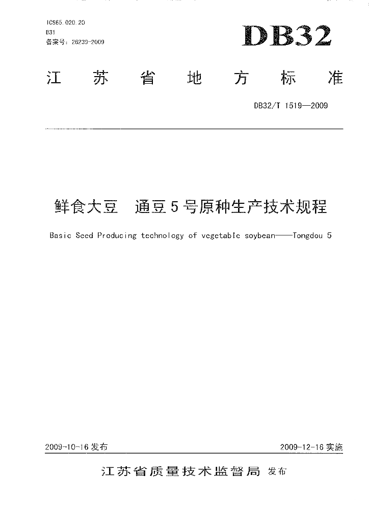 DB32/T 1519-2009 鲜食大豆 通豆5号原种生产技术规程