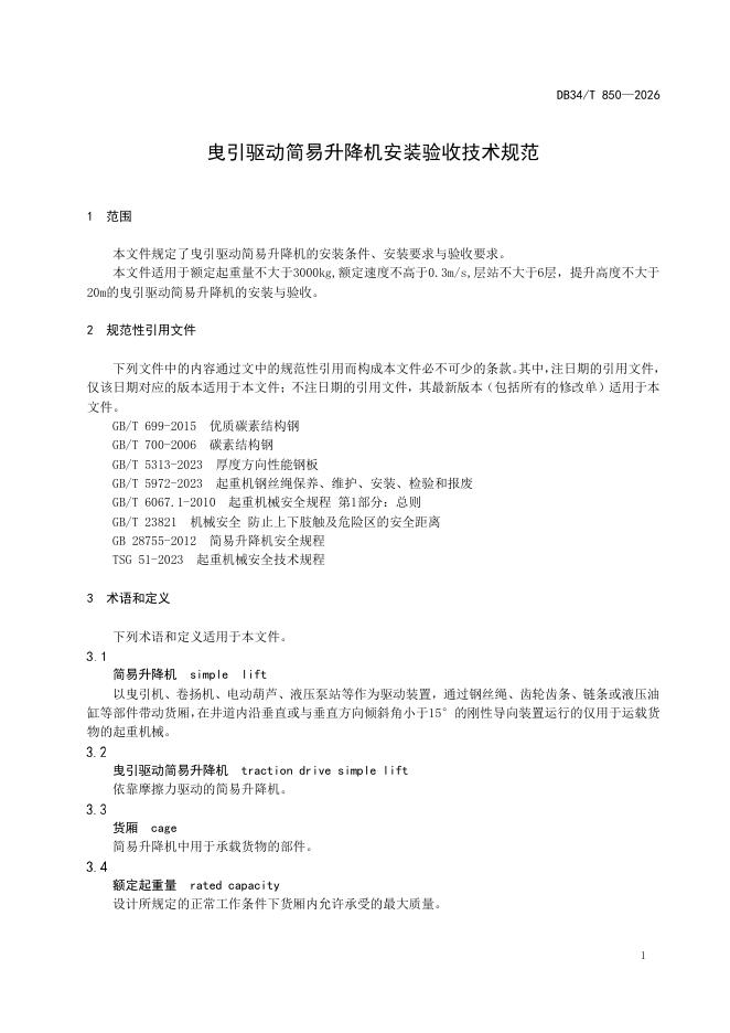 DB34/T 850-2026 曳引驱动简易升降机安装验收技术规范
