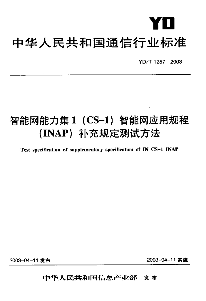 YD/T 1257-2003 智能网能力集 1(CS-1)智能网应用规程(INAP)补充规定测试方法