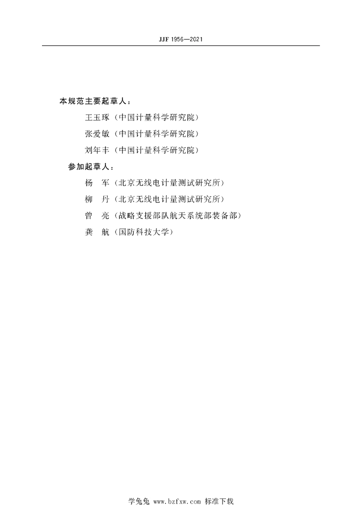 王玉琢(中国计量科学研究院)、张爱敏(中国计量科学研究院)、刘年丰(中国计量科学研究院)、杨军(北京无线电计量测试研究所)、柳丹(北京无线电计量测试研究所)、曾亮(战略支援部队航天系统部装备部)、龚航(国防科技大学)