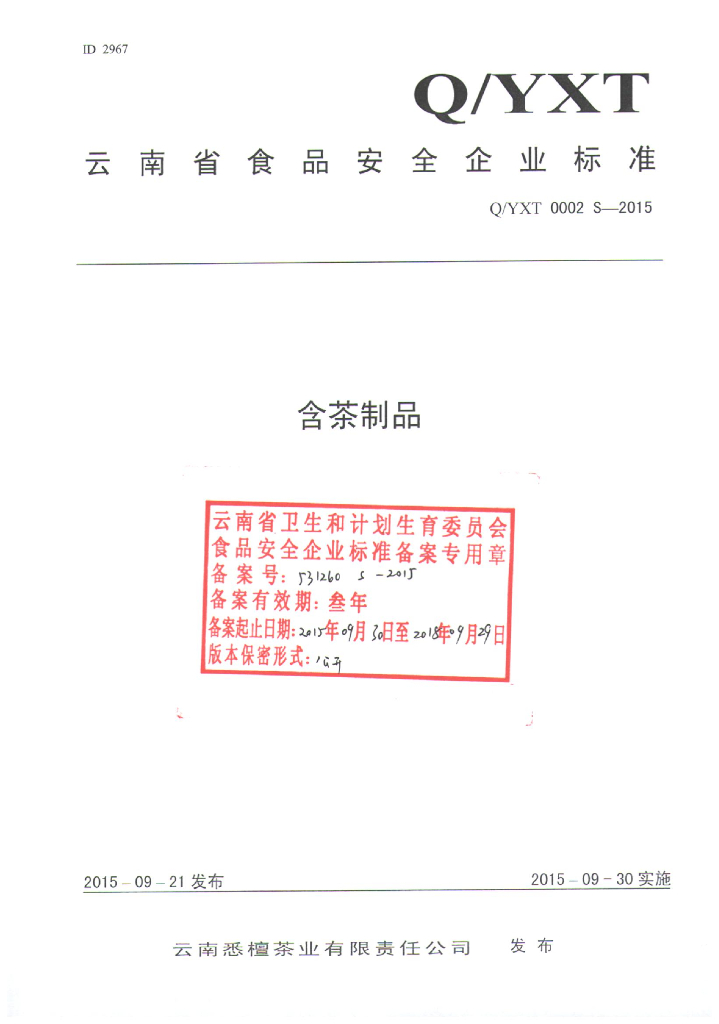 Q/YXT 0002S-2015 云南悉檀茶业有限责任公司 含茶制品