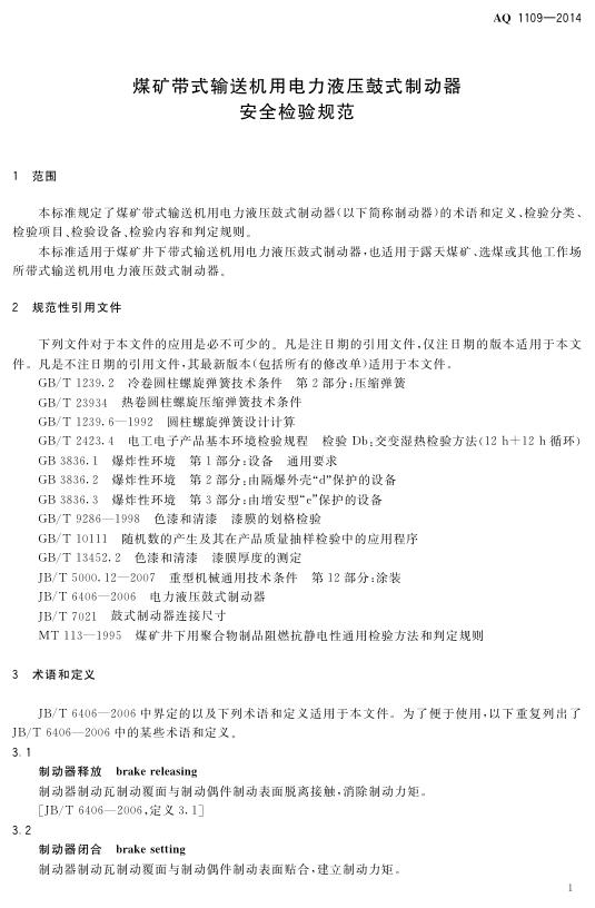 AQ/T 1109-2014 煤矿带式输送机用电力液压鼓式制动器安全检验规范