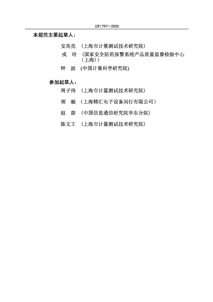 安兆亮(上海市计量测试技术研究院)、戎玲(国家安全防范报警系统产品质量监督检验中心(上海))、钟波(中国计量科学研究院)、周子炜(上海市计量测试技术研究院)、胡融(上海精汇电子设备闵行有限公司)、赵澎(中国信息通信研究院华东分院)、陈文王(上海市计量测试技术研究院)
