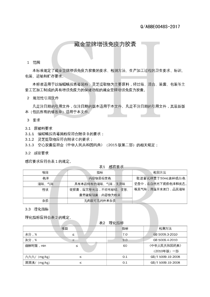 Q/ABBE 0048S-2017 藏金堂牌增强免疫力胶囊