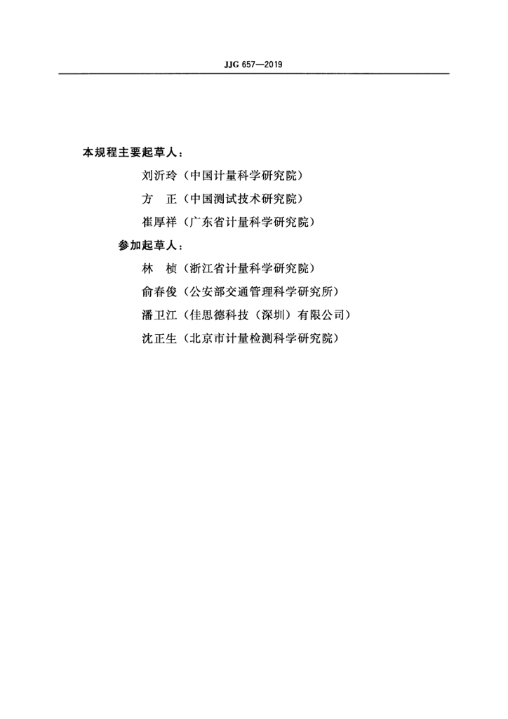刘沂玲(中国计量科学研究院)、方正(中国测试技术研究院)、崔厚祥(广东省计量科学研究院)、林桢(浙江省计量科学研究院)、俞春俊(公安部交通管理科学研究所)、潘卫江(佳思德科技(深圳)有限公司)、沈正生(北京市计量检测科学研究院)