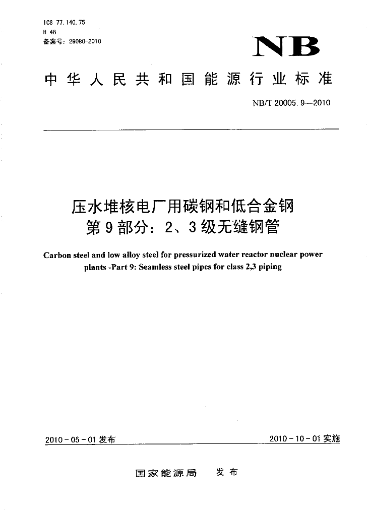 NB/T 20005.9-2010 压水堆核电厂用碳钢和低合金钢 第9部分:2、3级无缝钢管