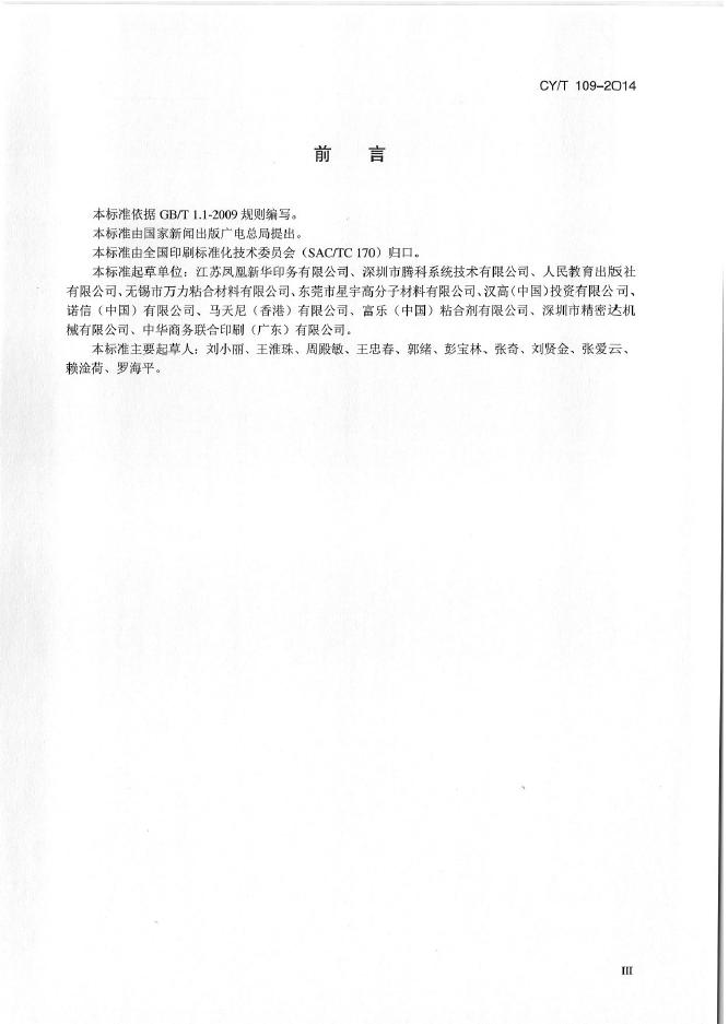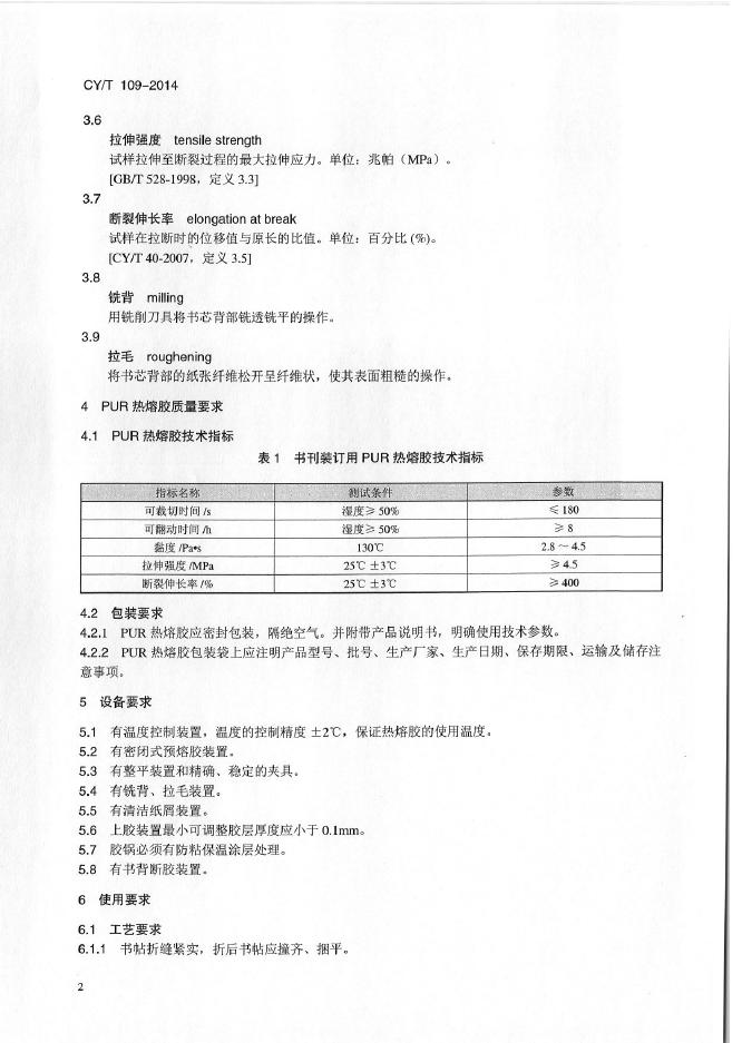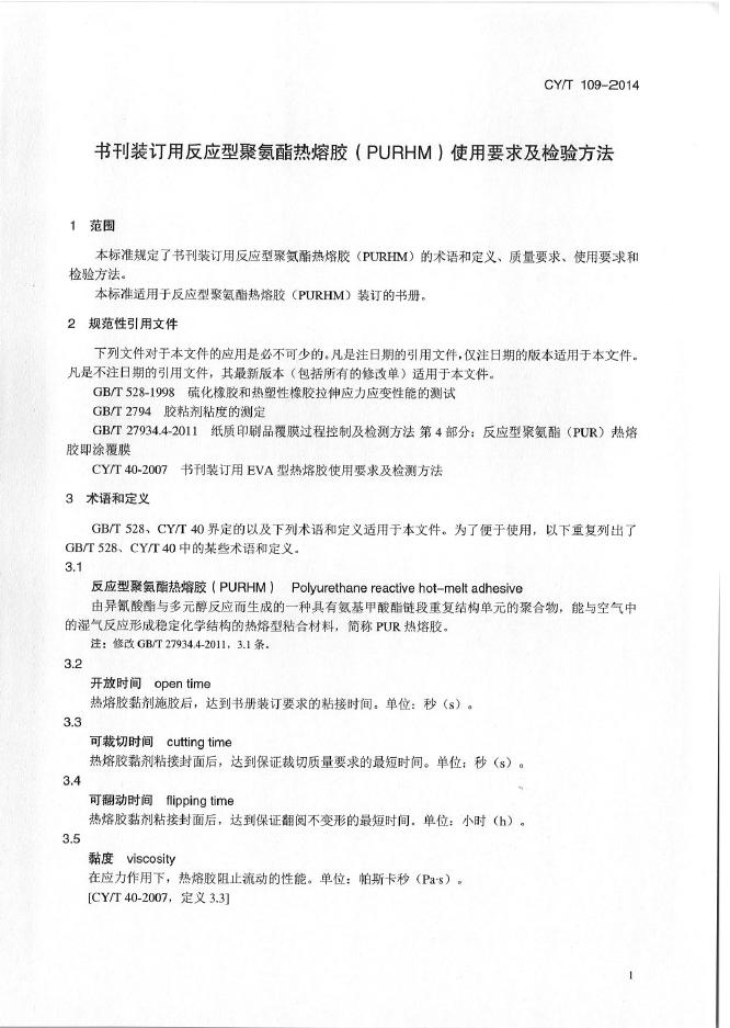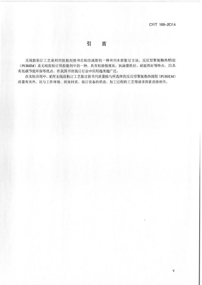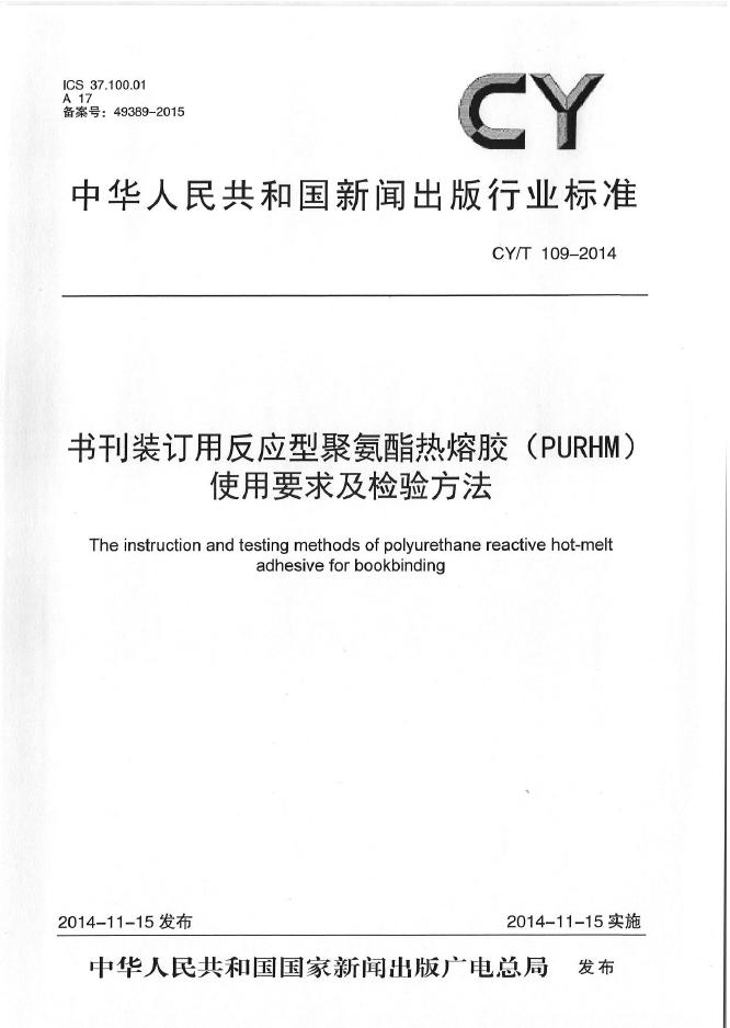 CY/T 109-2014 书刊装订用反应型聚氨酯热熔胶(PURHM)使用要求及检验方法