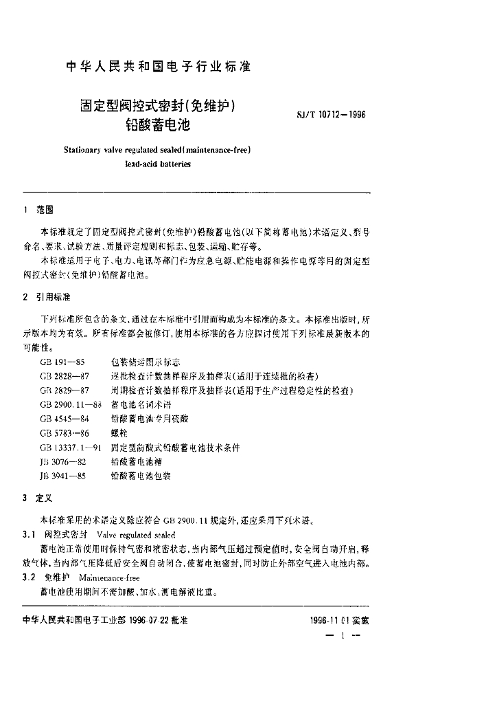 SJ/T 10712-1996 固定型阀控式密封(免维护)铅酸蓄电池