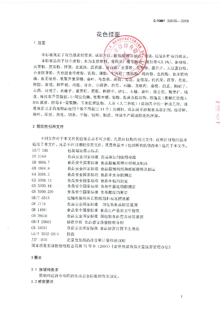 Q/KMMY 0003S-2018 花色挂面