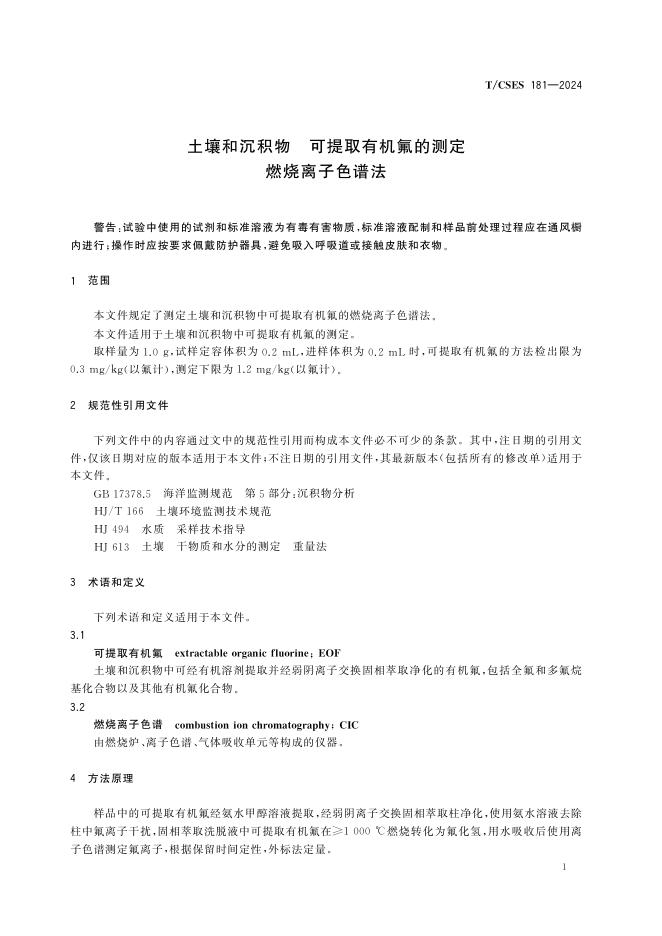 T/CSES 181-2024 土壤和沉积物 可提取有机氟的测定 燃烧离子色谱法