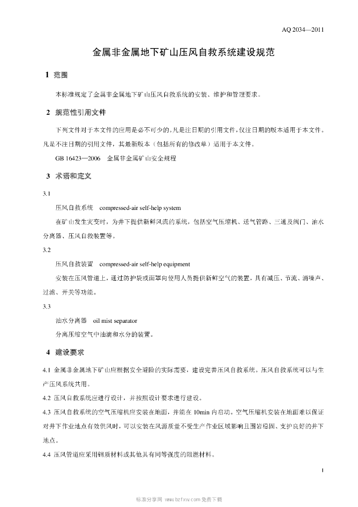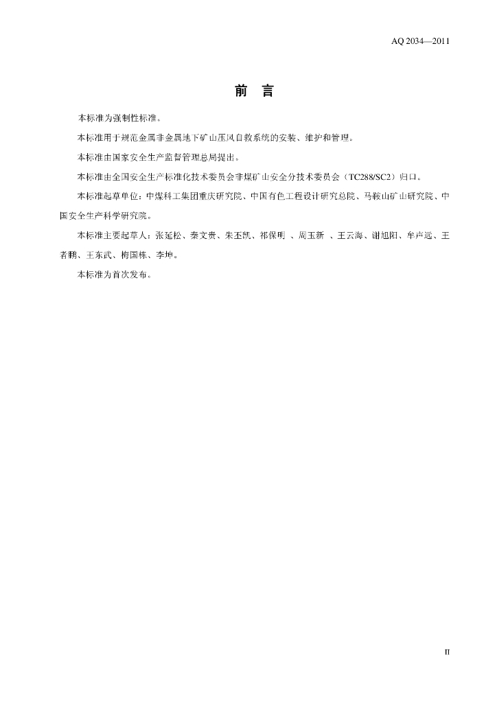 AQ 2034-2011 金属非金属地下矿山压风自救系统建设规范