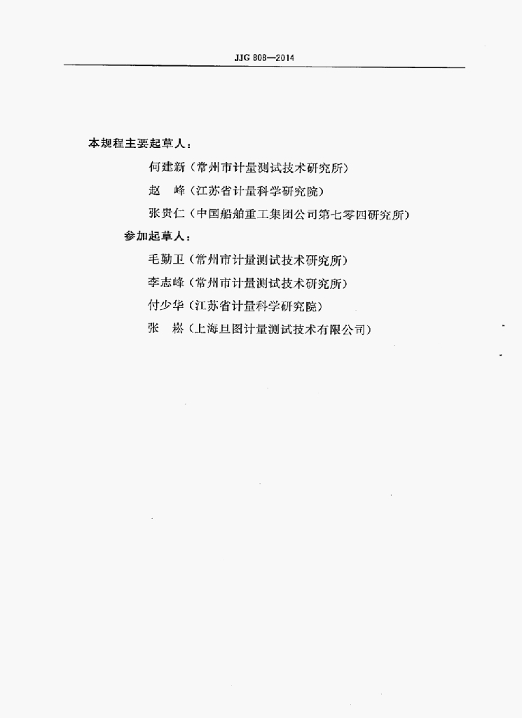 何建新(常州市计量测试技术研究所)、赵峰(江苏省计量科学研究院)、张贵仁(中国船舶重工集团公司第七零四研究所)、毛勤卫(常州市计量测试技术研究所)、李志峰(常州市计量测试技术研究所)、付少华(江苏省计量科学研究院)、张崧(上海旦图计量测试技术有限公司)
