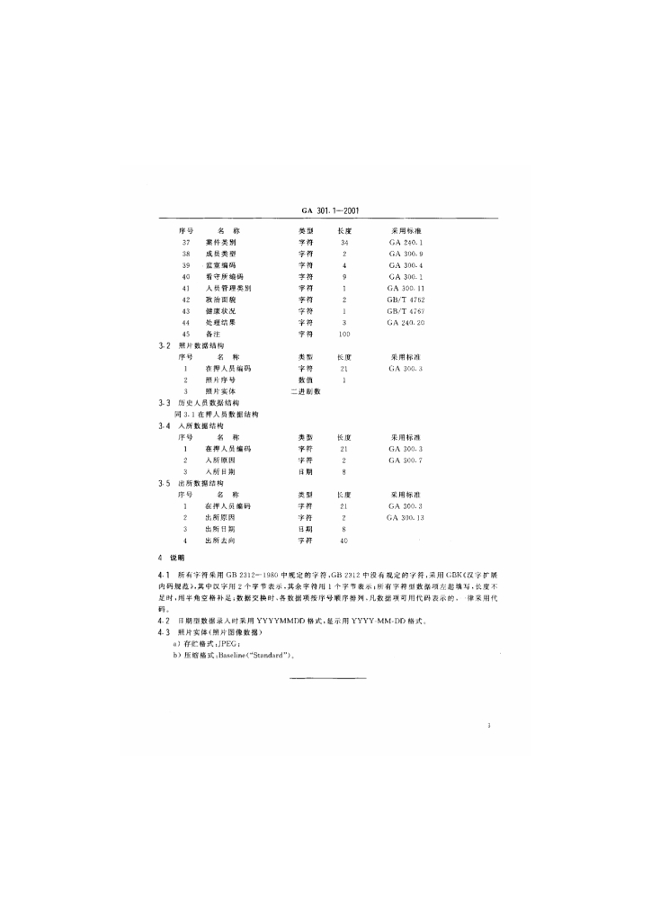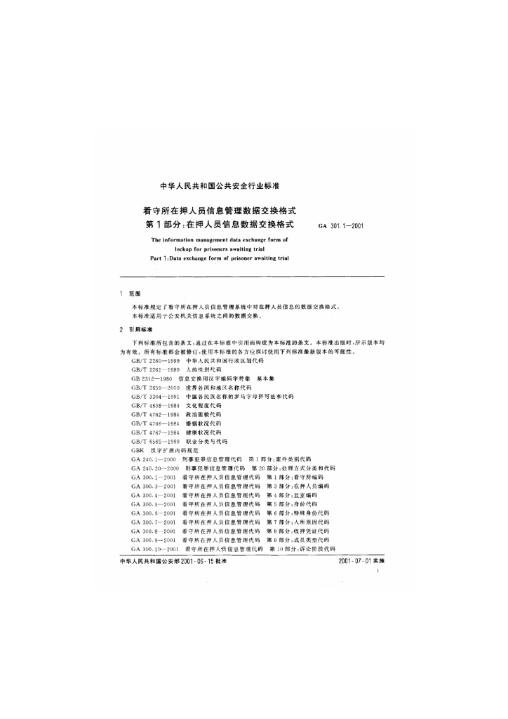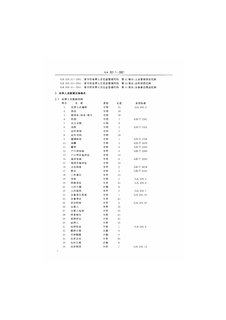 GA 301.1-2001 看守所在押人员信息管理数据交换格式 第1部分 在押人员信息数据交换模式