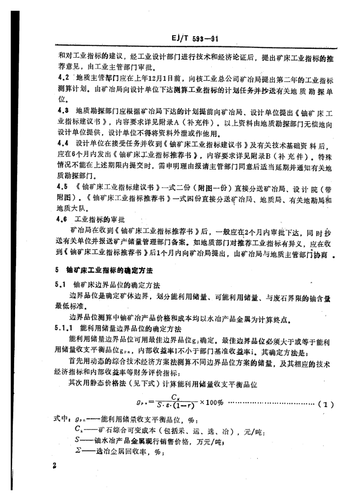 EJ/T 593-1991 铀矿床工业指标制定原则和方法的规定