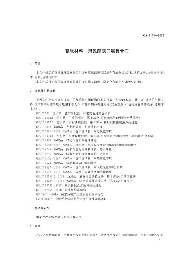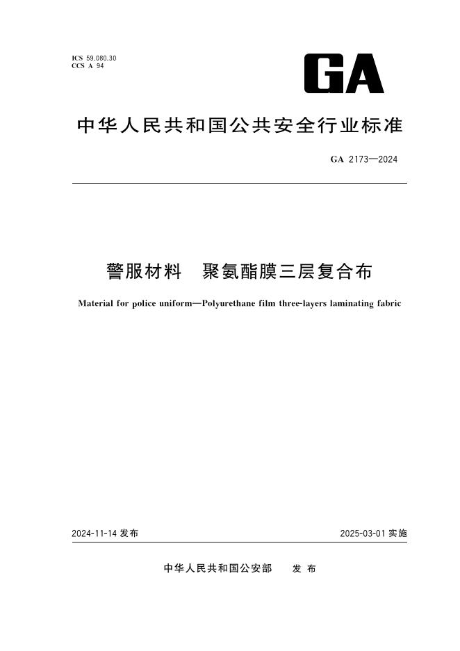 GA 2173-2024 警服材料 聚氨酯膜三层复合布