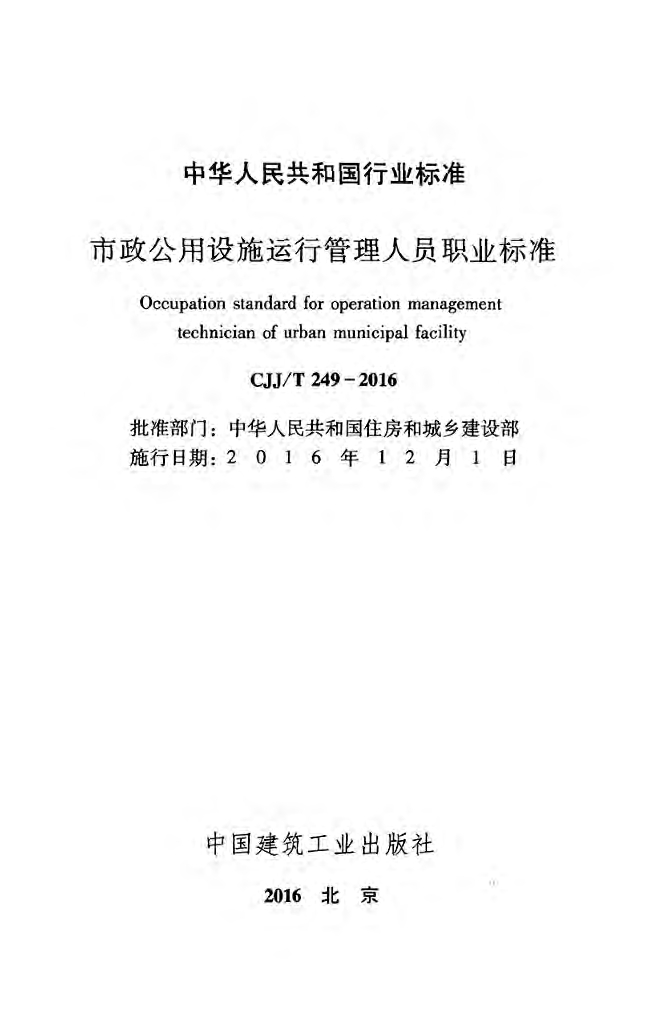 CJJ 249-2016 市政公用设施运行管理人员职业标准