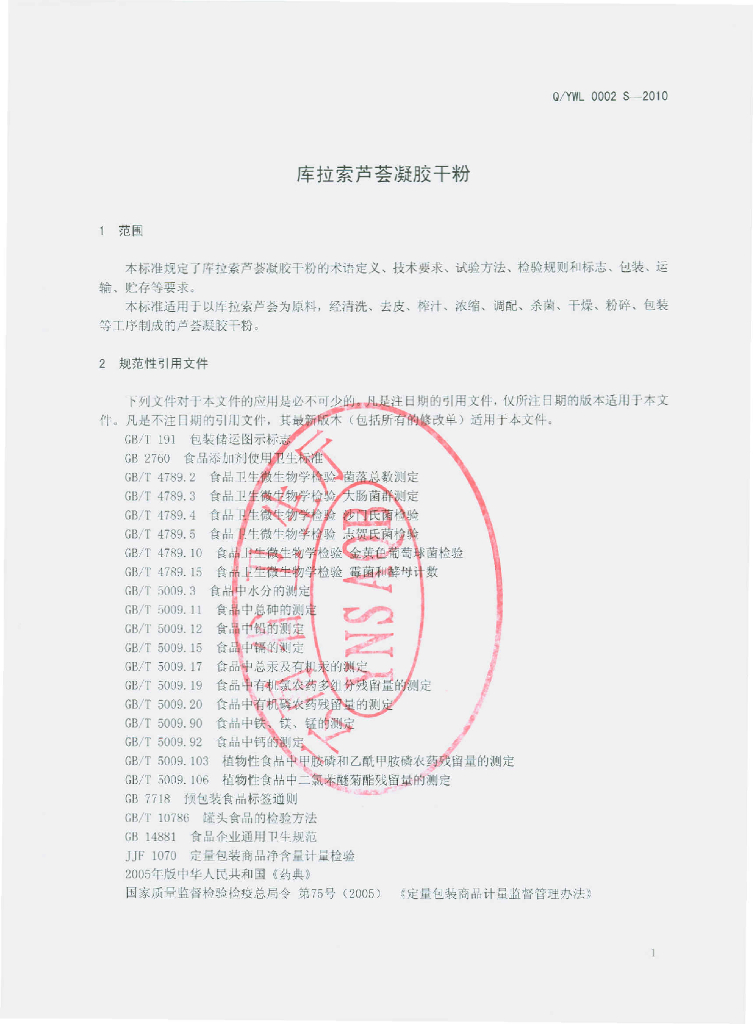 Q/YWL 0002S-2010 库拉索芦荟凝胶干粉