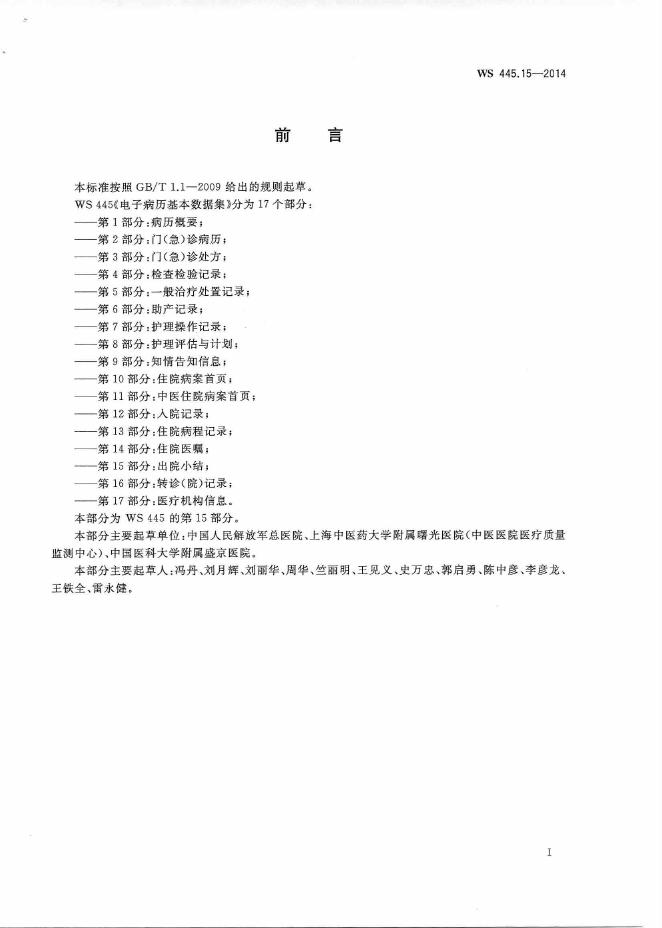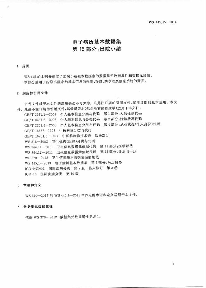 WS 445.15-2014 电子病历基本数据集 第15部分:出院小结