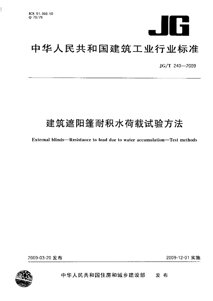 JG/T 240-2009 建筑遮阳篷耐积水荷载试验方法
