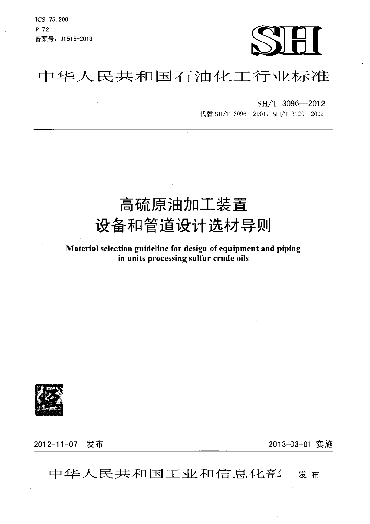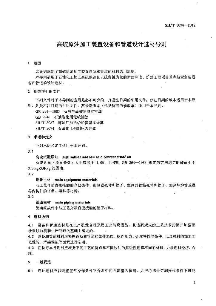 SH/T 3096-2012 高硫原油加工装置设备和管道设计选材导则