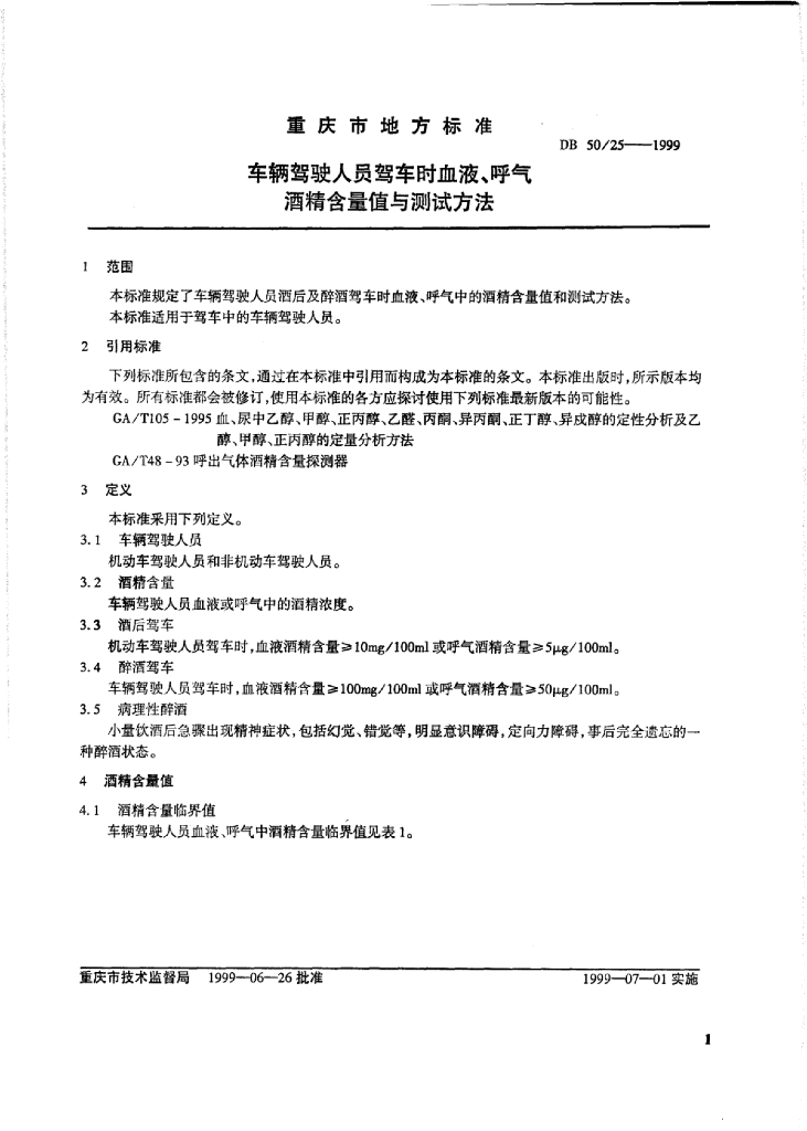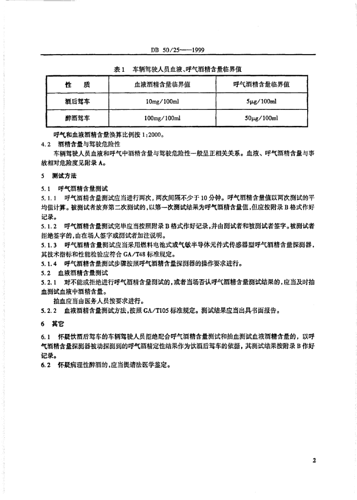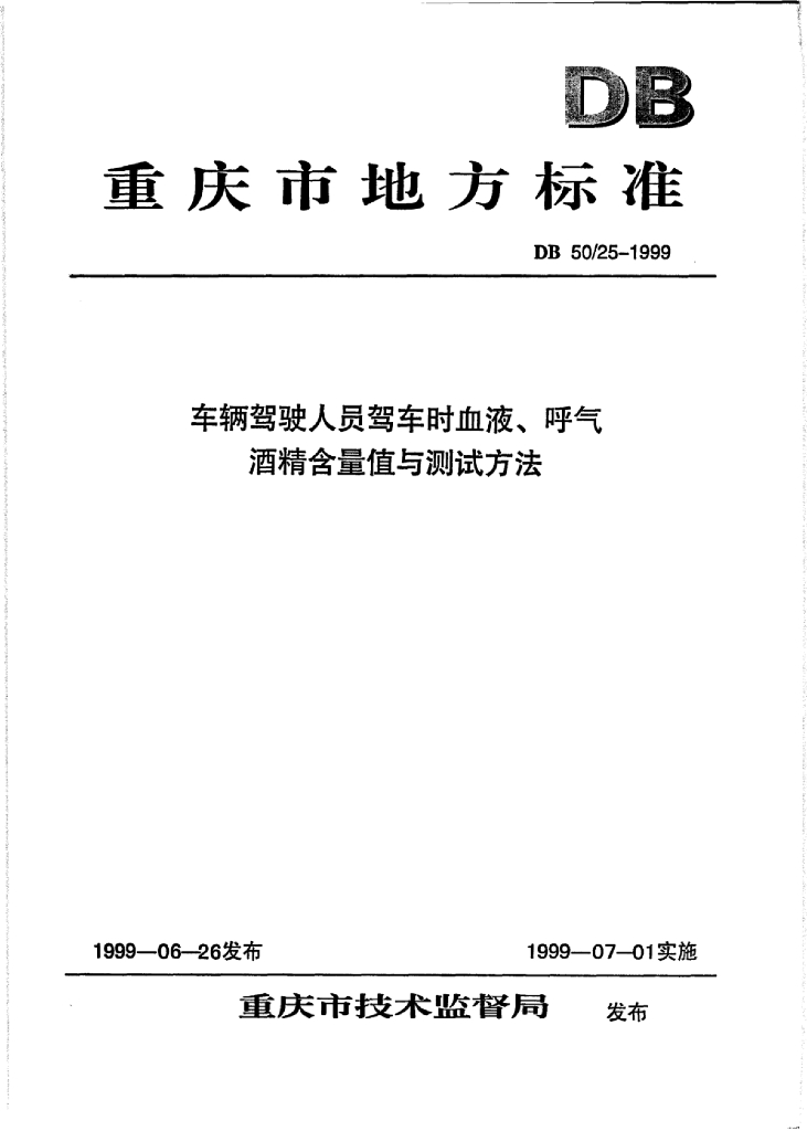 DB50/ 25-1999 车辆驾驶人员驾车时血液、呼气酒精含量值与测试方法