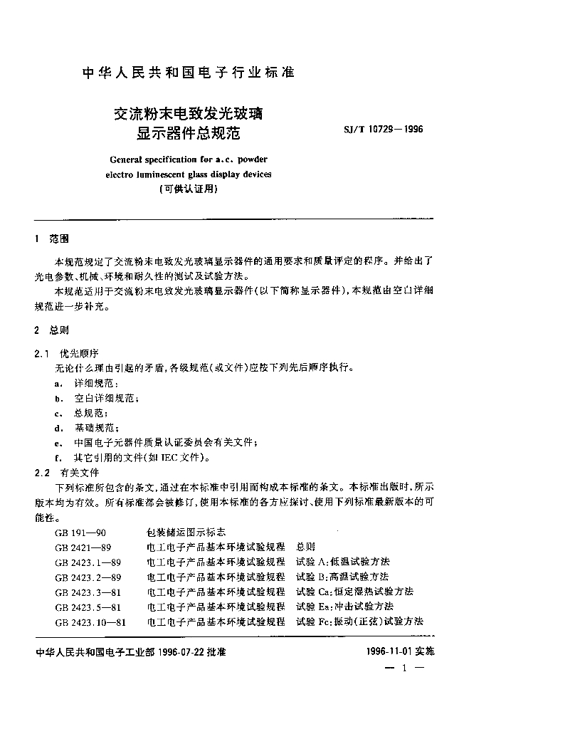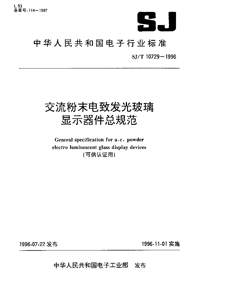 SJ/T 10729-1996 交流粉末电致发光玻璃显示器件总规范(可供认证用)