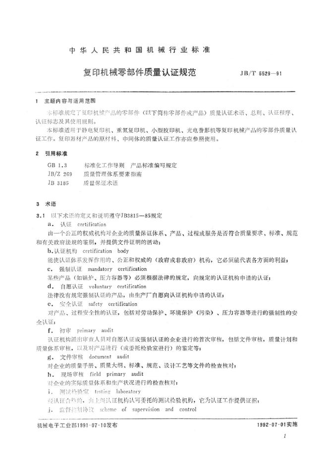 JB/T 5529-1991 复印机械零部件质量认证规范