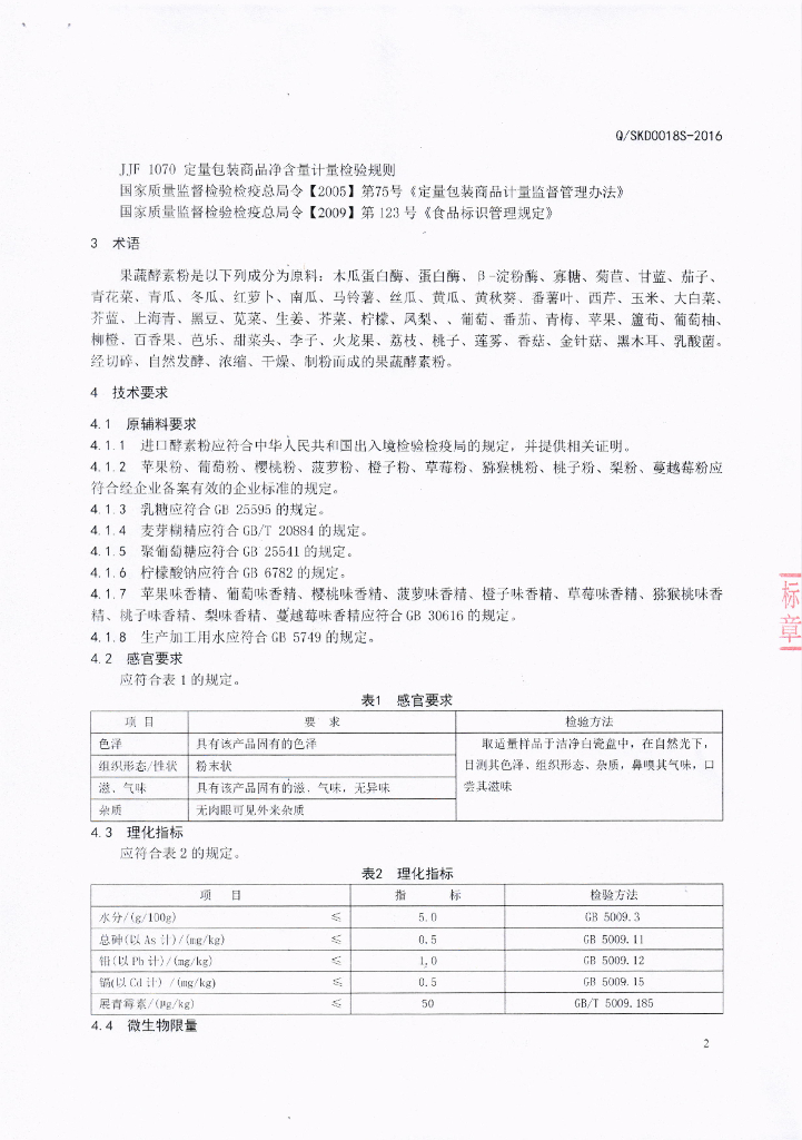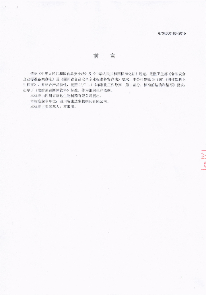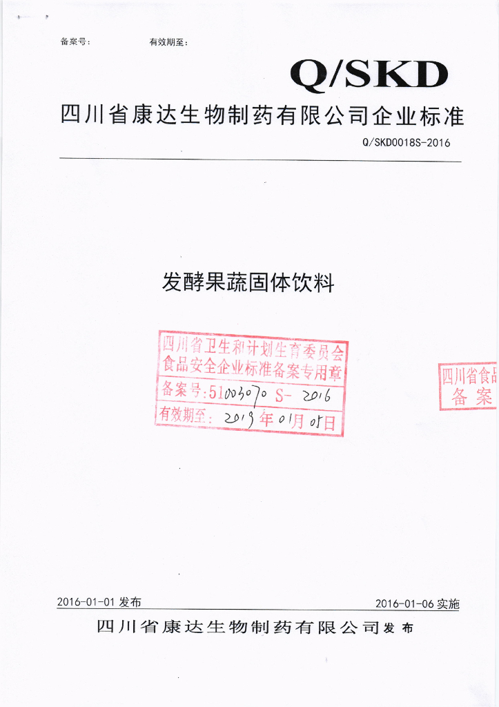 Q/SKD 0018S-2016 四川省康达生物制药有限公司 发酵果蔬固体饮料