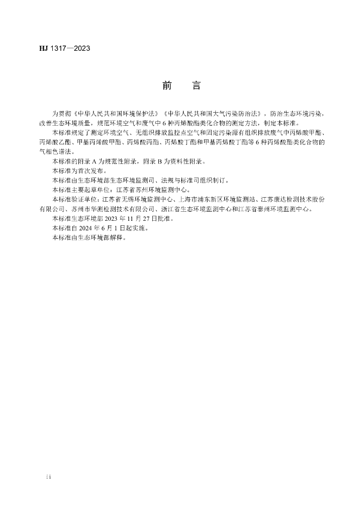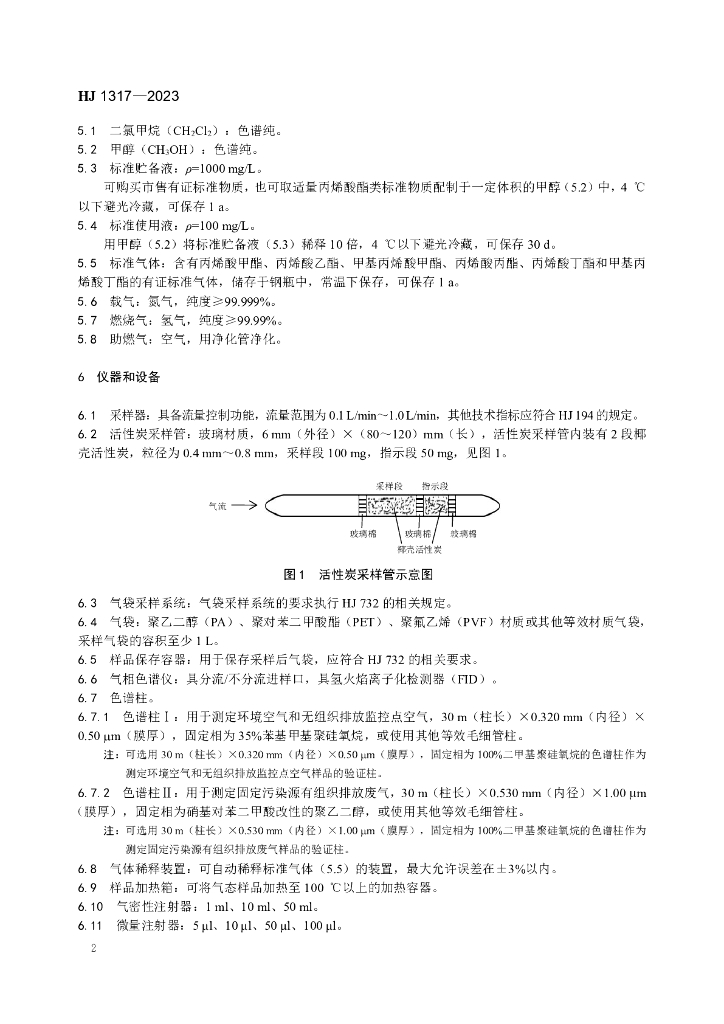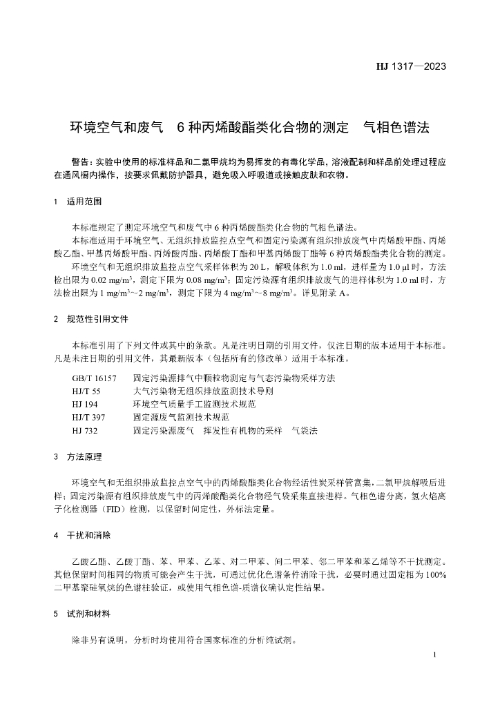 HJ 1317-2023 环境空气和废气 6种丙烯酸酯类化合物的测定 气相色谱法