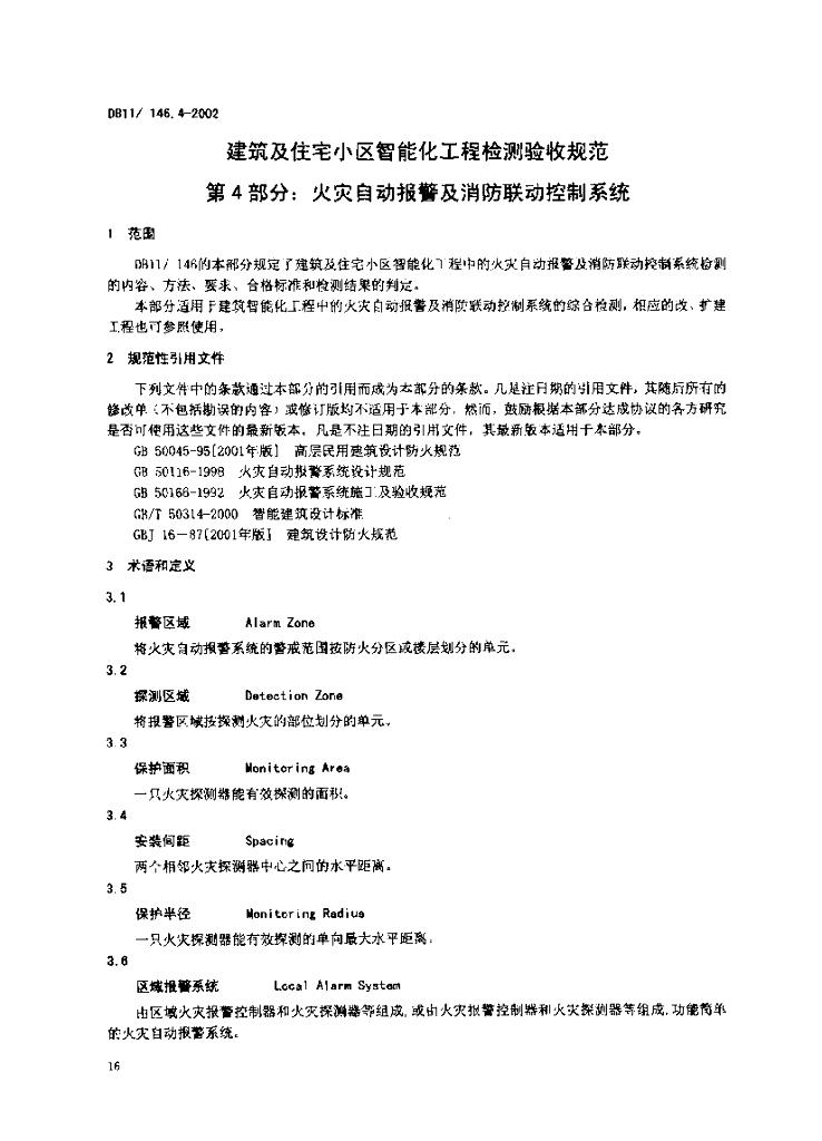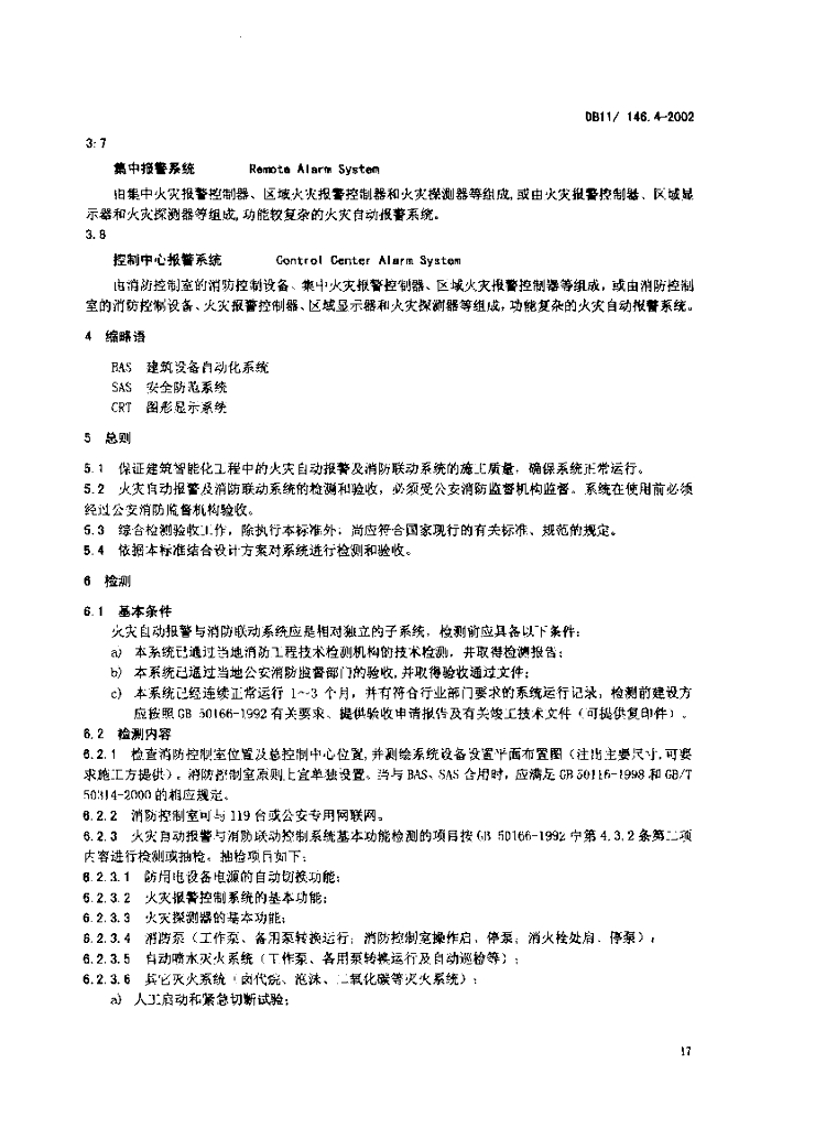 DB11/ 146.4-2002 建筑及住宅小区智能化工程检测验收规范 第4部分:火灾自动报警及消防联动控制系统