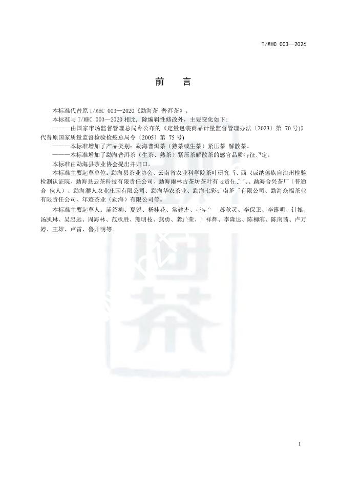 T/MHC 003-2026 勐海茶 普洱茶