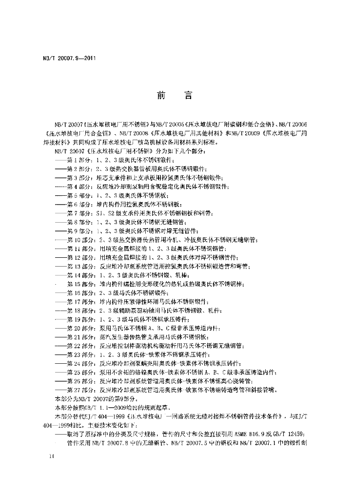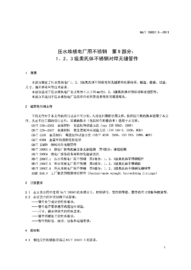 NB/T 20007.9-2011 压水堆核电厂用不锈钢 第9部分:1、2、3级奥氏体不锈钢对焊无缝管管件