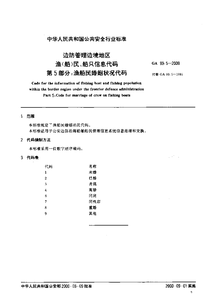 GA 99.5-2000 边防管理边境地区 渔(船)民、船只信息代码 第5部分 渔船民婚姻状况代码