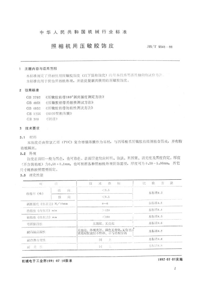 JB/T 5541-1991 照相机用压敏胶饰皮