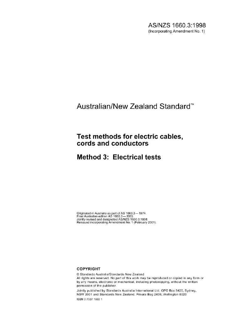 AS/NZS 1660.3:1998 电缆 软线 导体的测试方法 方法3 电气测试