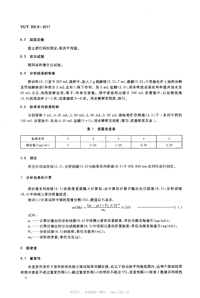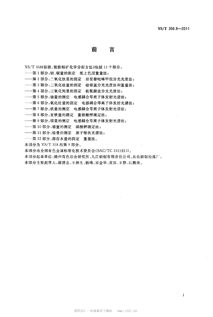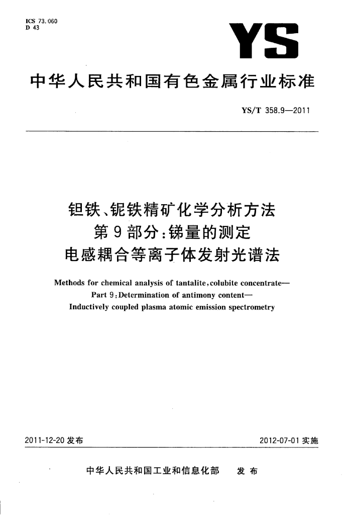 YS/T 358.9-2011 钽铁、铌铁精矿化学分析方法 第9部分:锑量的测定电感耦合等离子体发射光谱法
