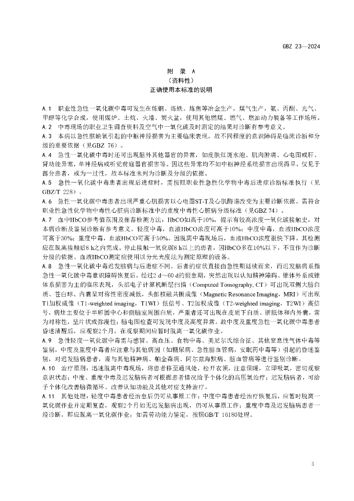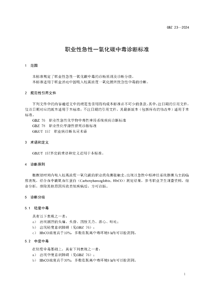 GBZ 23-2024 职业性急性一氧化碳中毒诊断标准
