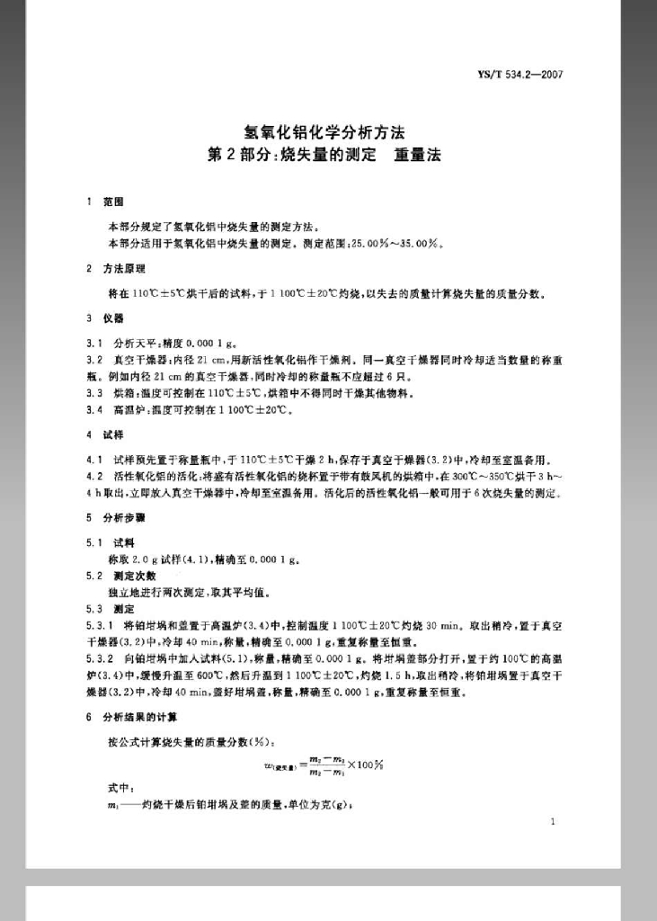 YS/T 534.2-2007 氢氧化铝化学分析方法 第2部分 烧失量的测定 重量法