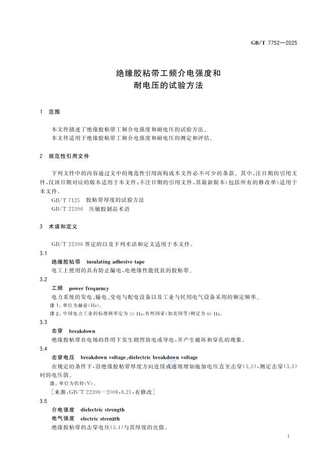 GB/T 7752-2025 绝缘胶粘带工频介电强度和耐电压的试验方法