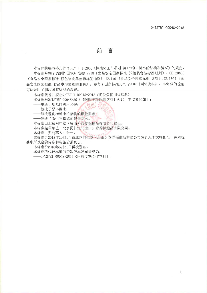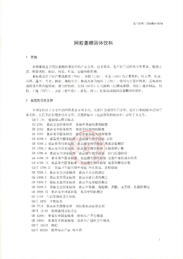 Q/TSTRT 0004S-2018 阿胶姜糖固体饮料