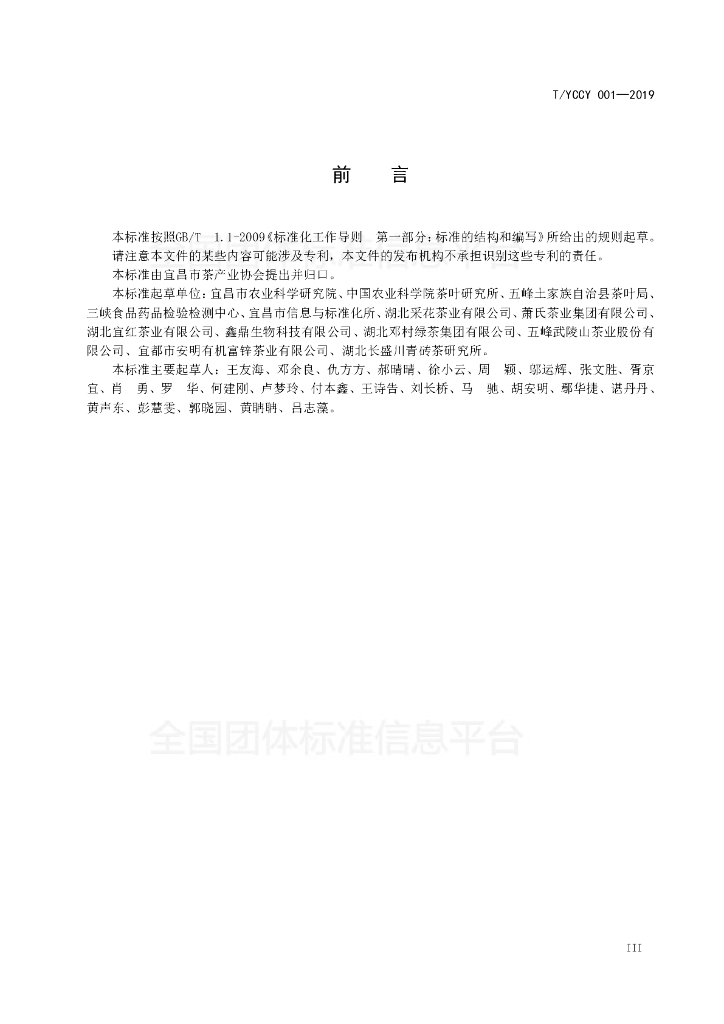 宜昌市农业科学研究院、中国农业科学院茶叶研究所、五峰土家族自治县茶叶局、三峡食品药品检验检测中心、宜昌市信息与标准化所、湖北采花茶业有限公司、萧氏茶业集团有限公司、湖北宜红茶业有限公司、鑫鼎生物科技有限公司、湖北邓村绿茶集团有限公司、五峰武陵山茶业股份有限公司、宜都市安明有机富锌茶业有限公司、湖北长盛川青砖茶研究所