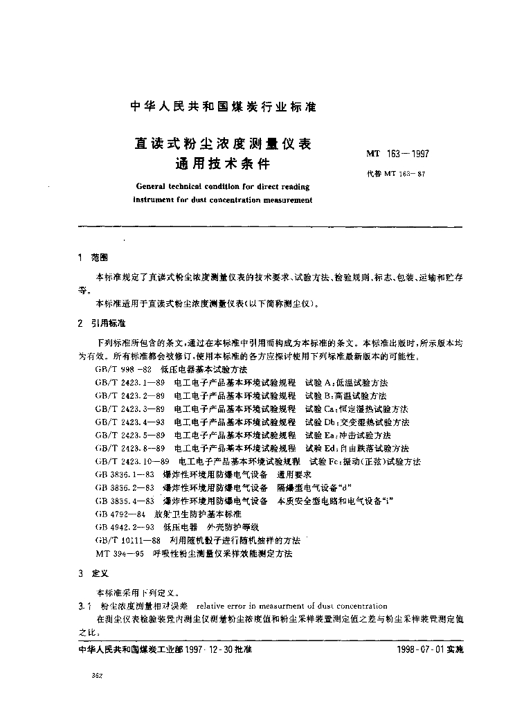 MT 163-1997 直读式粉尘浓度测量仪表通用技术条件