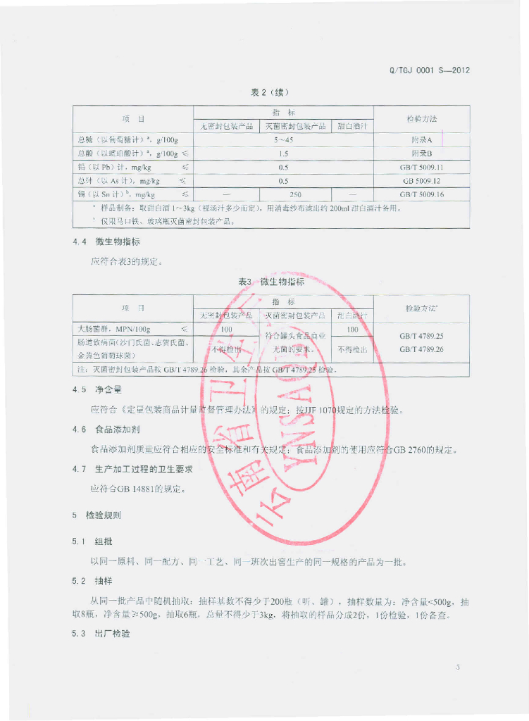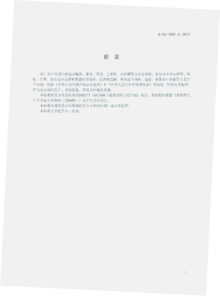Q/TGJ 0001S-2012 甜白酒