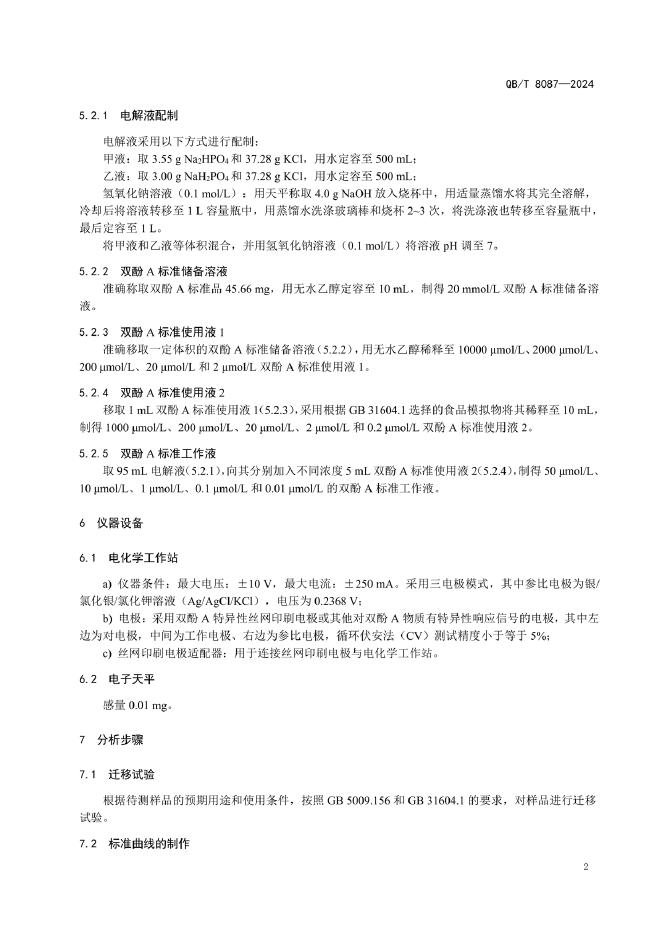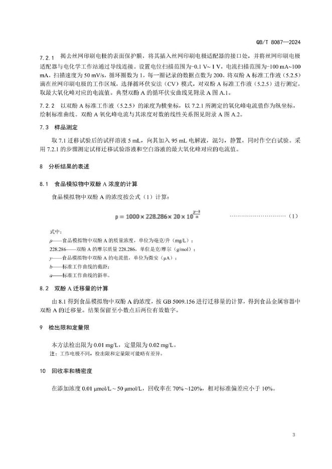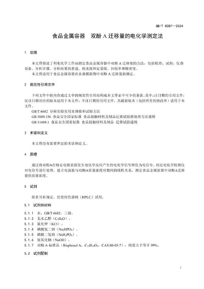 QB/T 8087-2024 食品金属容器 双酚A迁移量的电化学测定法