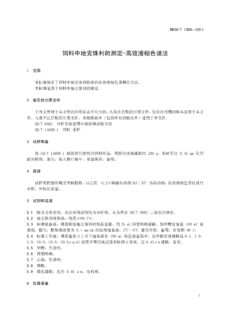DB34/T 1360-2011 饲料中地克珠利的测定高效液相色谱法