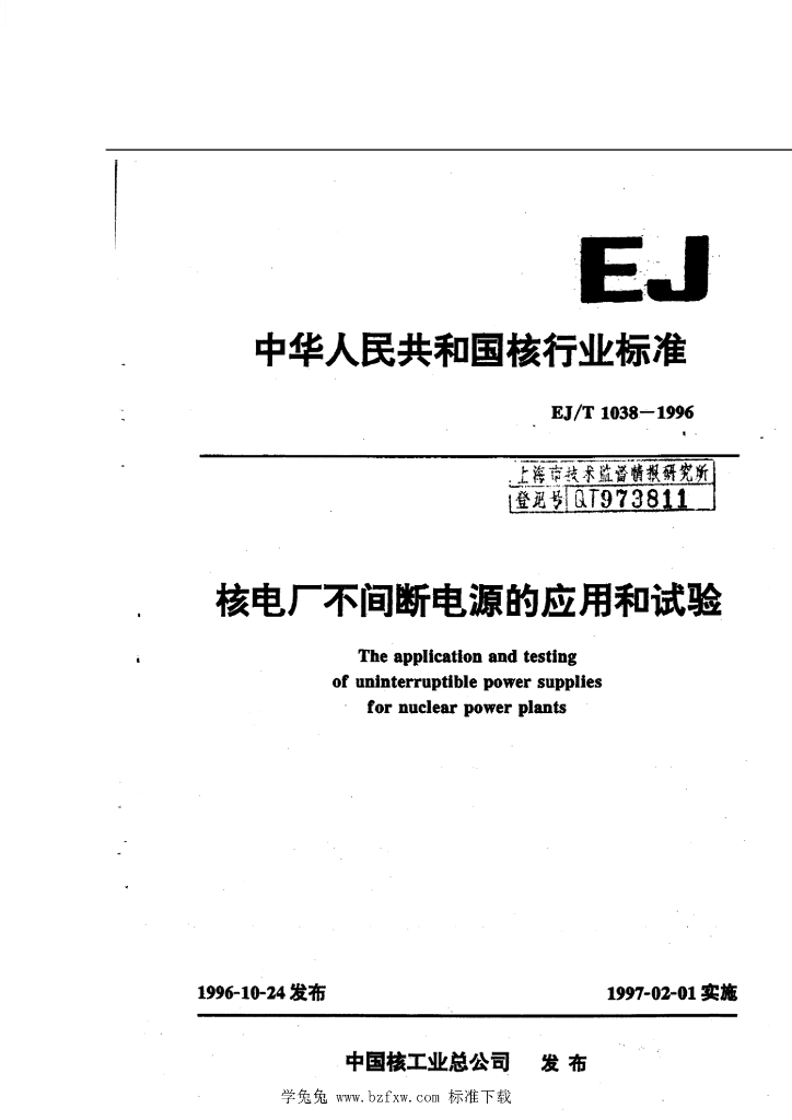 EJ/T 1038-1996 核电厂不间断电源的应用和试验