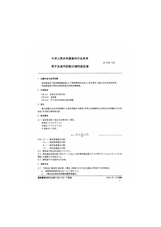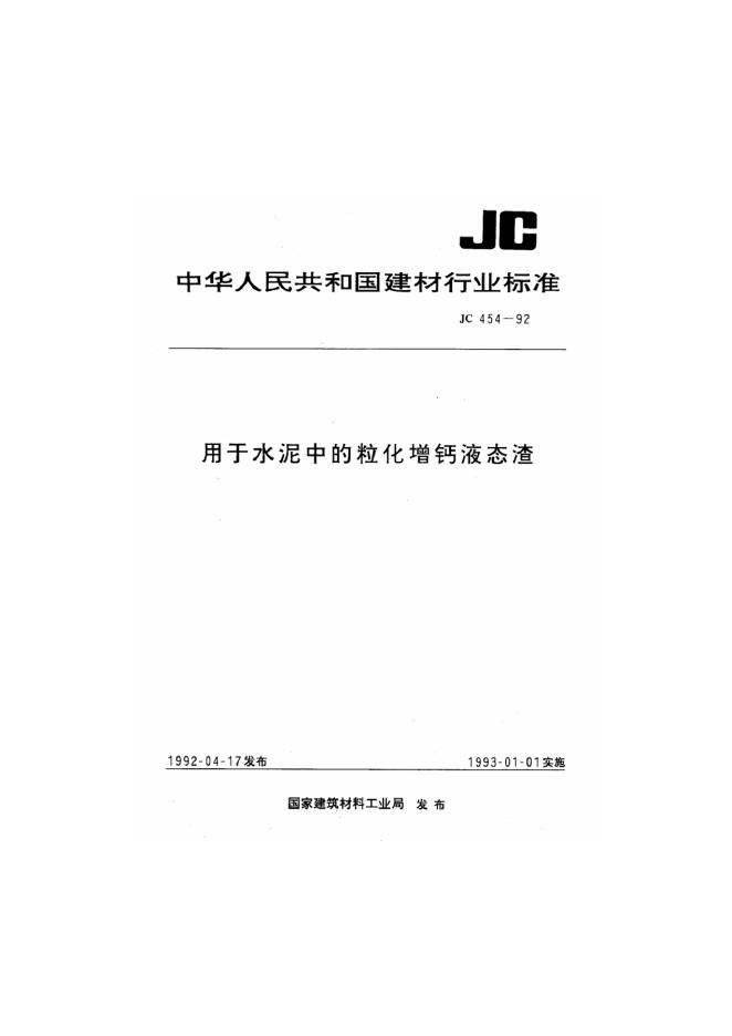 JC 454-1992 用于水泥中的粒化增钙液态渣