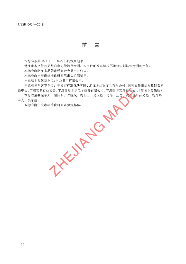 得力集团有限公司、宁波市标准化研究院、浙江金丝猴文具有限公司、国家文教用品质量监督检验中心、宁波文具行业协会、宁波艾斯卡尔电子商务有限公司、宁波振博文具有限公司