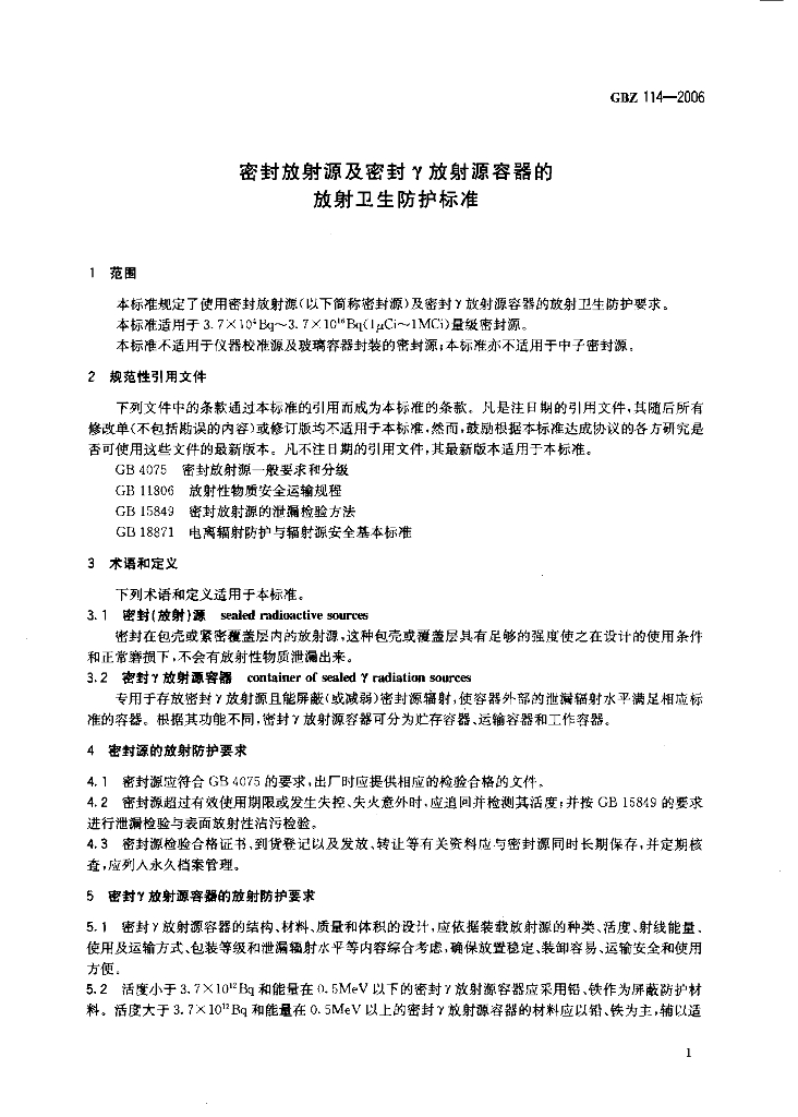 GBZ 114-2006 密封放射源及密封γ放射源容器的放射卫生防护标准