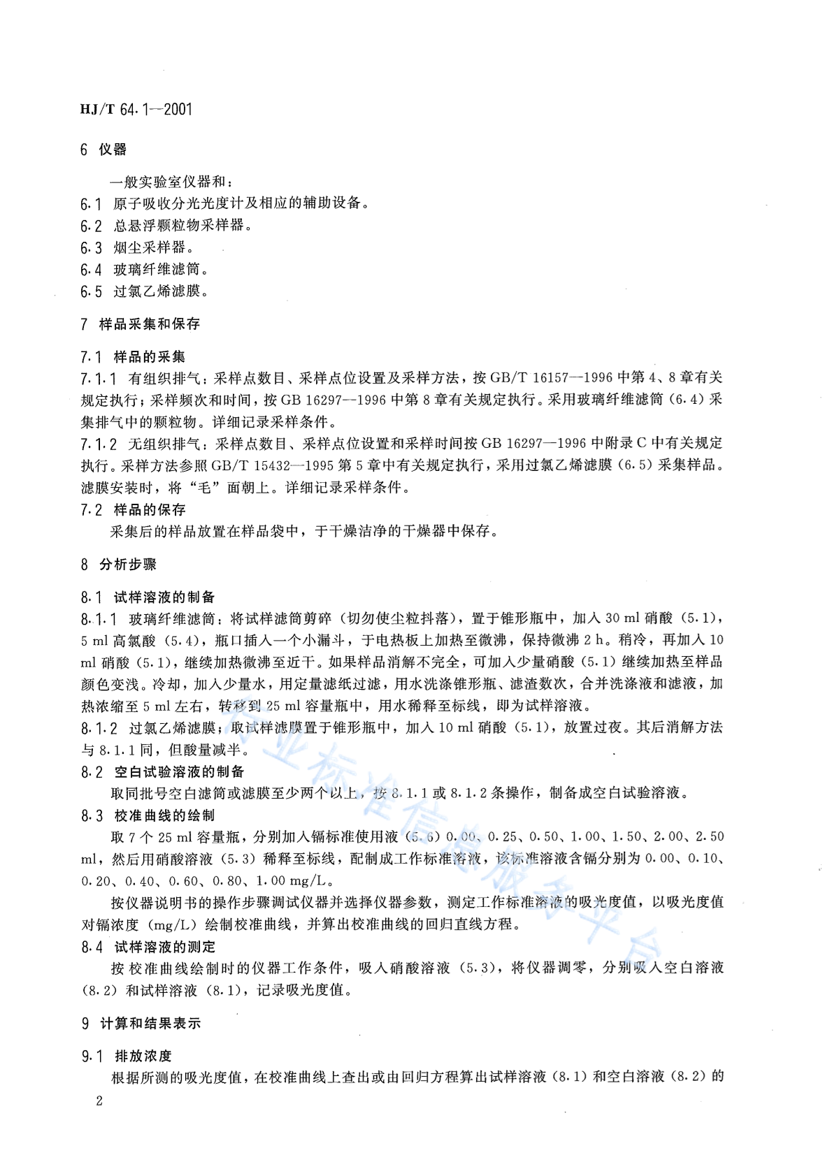 HJ/T 64.1-2001 大气固定污染源 镉的测定 火焰原子吸收分光光度法